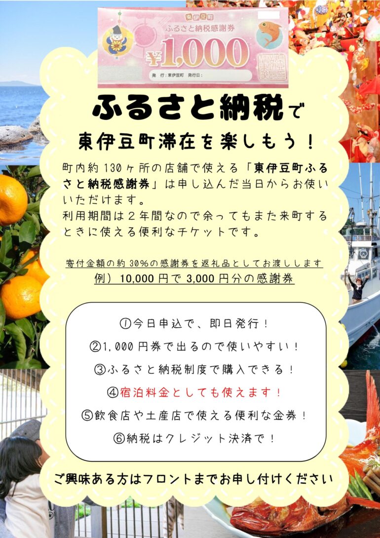 このたび 「ふたりの湯宿 湯花満開」フロントにて、東伊豆町のふるさと納税がその場で行えるようになりました。